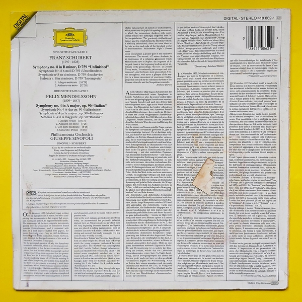 Schubert – Mendelssohn – Symphonie No.8 “Unvollendete” / Symphonie No.4 “Italienische” 1984 Almanya Baskısı Plak : 9 – NM Müzik türü : Klasik